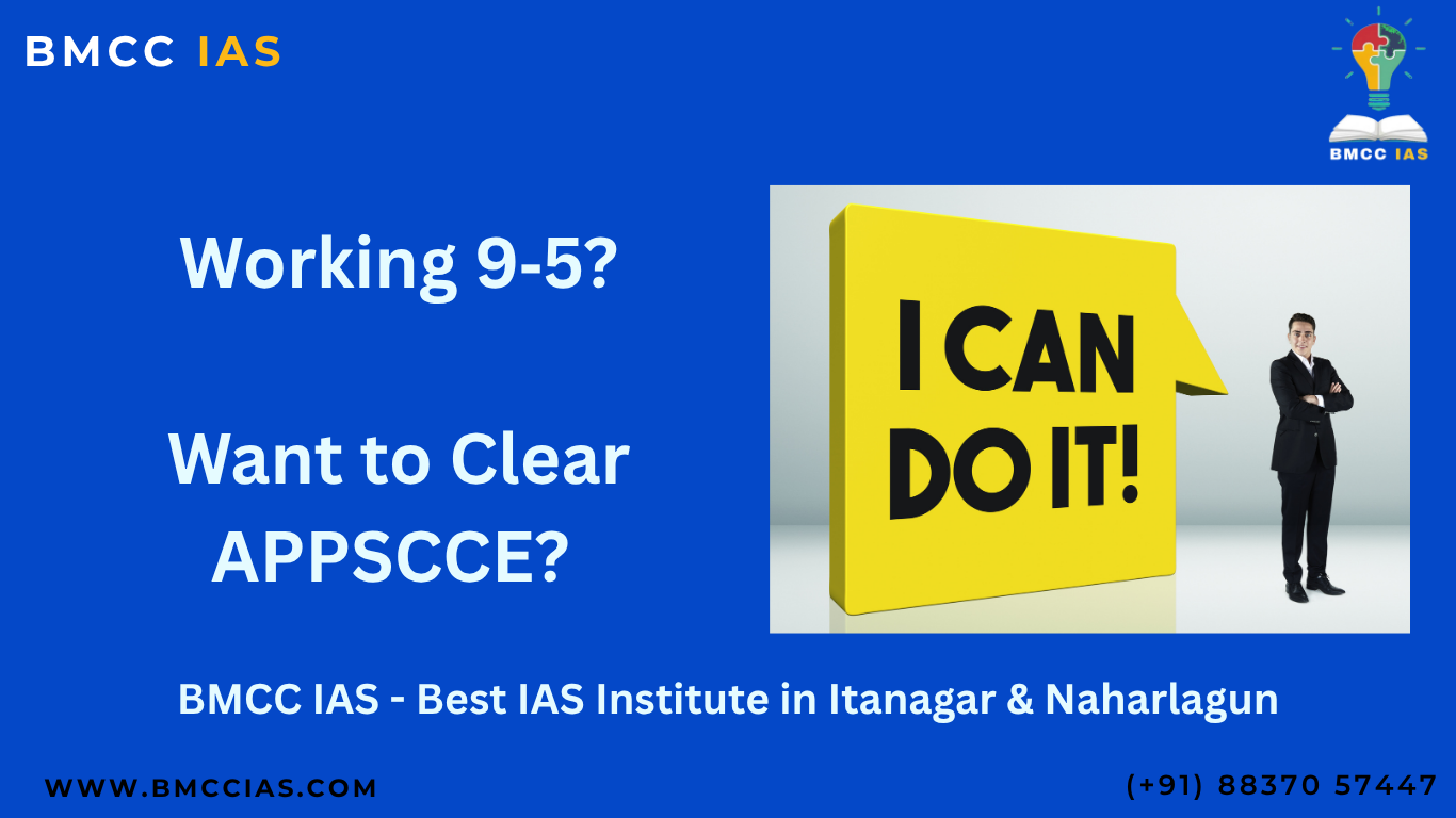Even with a full‑time 9‑5 job, your APPSCCE dream is still achievable. This blog explains how BMCC IAS Itanagar’s recorded‑replay classes and weekend batches create a flexible, structured roadmap that helps working professionals prepare effectively for APPSCCE and UPSC without quitting their jobs.